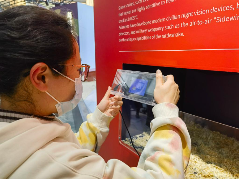 游客在上海自然博物馆里通过红外互动装置了解蛇如何“锁定”猎物。新华社记者 陈爱平 摄