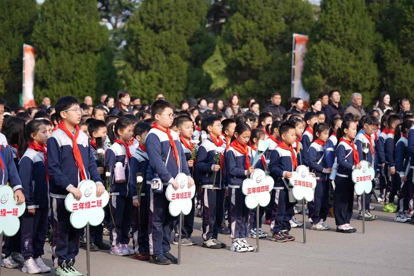 清晨的英雄广场,松柏苍翠、庄严肃穆,烈士群雕巍然矗立,素洁繁花静寄哀思。上午8时20分,礼兵就位,主持人宣布祭扫仪式开始。全体人员肃立,奏唱《中华人民共和国国歌》。少先队员列队献唱《我们是共产主义接班人》,歌声稚嫩却坚定,展现出新时代少年赓续红色血脉的昂扬风貌。伴随着深情悠扬的《献花曲》,礼兵抬着花篮缓步前行,步履沉稳、神情庄重,将花篮整齐敬献于烈士群雕之前。各界代表轻步上前,整理花篮挽联,一言一行尽寄哀思,一举一动皆是敬意。随后,全场人员行三鞠躬礼,向革命烈士致以深切的缅怀。