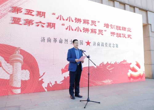 仪式上,陵园(纪念馆)主任(馆长)孙晓峰代表济南革命烈士陵园(济南战役纪念馆)致辞,详细介绍了纪念馆“小小讲解员”服务品牌开创以来为我市青少年红色教育事业做出的贡献,真诚地表达了对各位学员的欢迎。