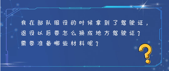 3、退役军人携带居民身份证原件(有效居住证原件)及复印件、退役军人证明原件及复印件、《机动车驾驶证申请表》《机动车驾驶人身体条件证明》、驾驶人本人近期一寸白底免冠正面彩色照片4-6张、军队或武装警察部队驾驶人档案及部队机动车驾驶证,到车辆管理所办理换证手续。