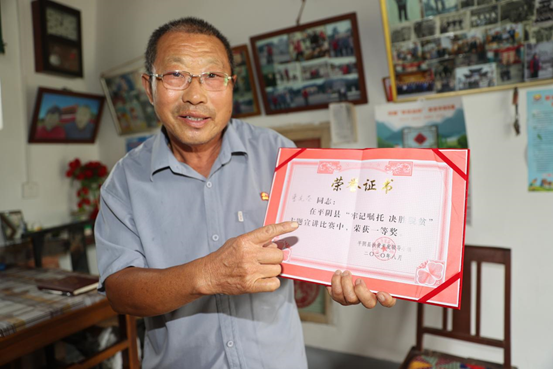 厄运连降,他逆境之中顽强抗争,用超常的意志撑起一个家庭;政策帮扶,党的阳光照亮前程,他和村民携手踏上小康之路;矢志为民,他知党恩感党情甘当义工,争做牢记初心服务人民的标兵。他是一位平凡的退役军人,却用一言一行书写出自己非凡的人生。他就是山东省平阴县孝直镇后庄科村的退役老兵曹先苓。